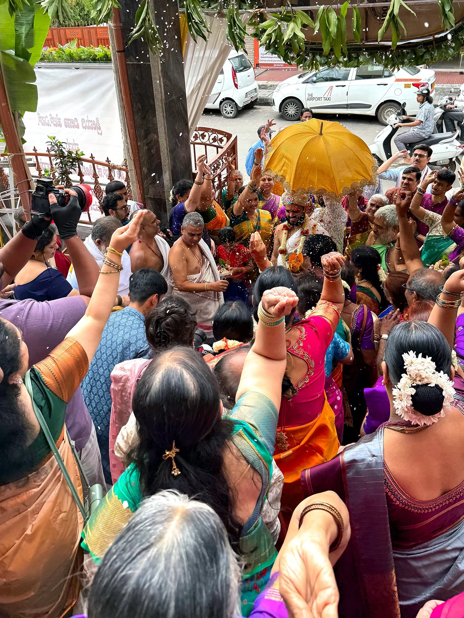 Everyone gathers out on the front steps of the venue and it’s hard to see what is happening, but powders are applied to Goutham’s face as a man stands behind him with an ornate gold umbrella. In the crowd, we are all handed rice, presumably to pelt the groom with. Indeed, this is what the rice is for, and the gold umbrella does little to shield the onslaught of tiny grains.