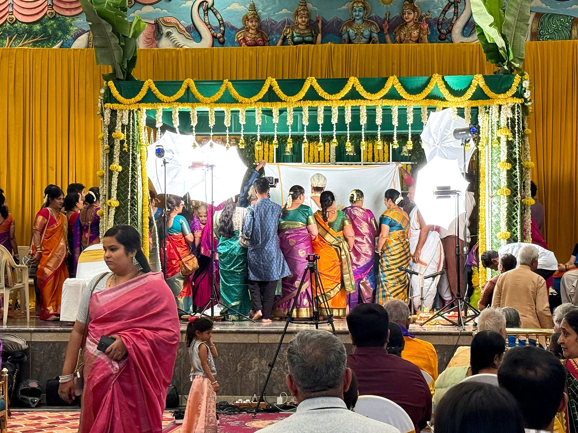 Today, there is a large video screen set up that allows the audience to see the intricacies of the rituals. On stage, Goutham eats a tiny spoonful of something and then is handed a whole coconut. A saxophone solo begins. Several men fiddle with a large, yellow rubber band. A cloth is held up and Goutham faces it. The bride is carried in behind the sheet, and everyone on stage starts chanting. The sheet drops and Goutham sees his bride, presumably for the first time. She looks only slightly similar to the doll he was presented the night before. Goutham’s back is to the audience, so it is impossible to tell if he is pleased or disappointed.