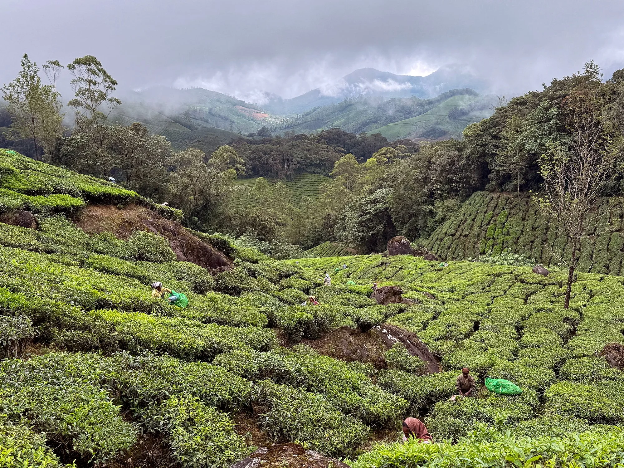 By the time our walk had taken us up to the crests of hills overlooking the tea fields, clouds blew in and obstructed the views. We stopped at a cloudy overlook and Shiva began pulling out bundles from his backpack for breakfast: plastic bags filled with lentil curry with a side of puttu for dipping - soft, crumbly patties made from rice flour and coconut. He also had fried dough balls called bonda, like slightly-sweet donut holes seasoned with cardamom and fennel. As we ate, the clouds lifted and fell again, giving us glimpses of the bright green fields below.