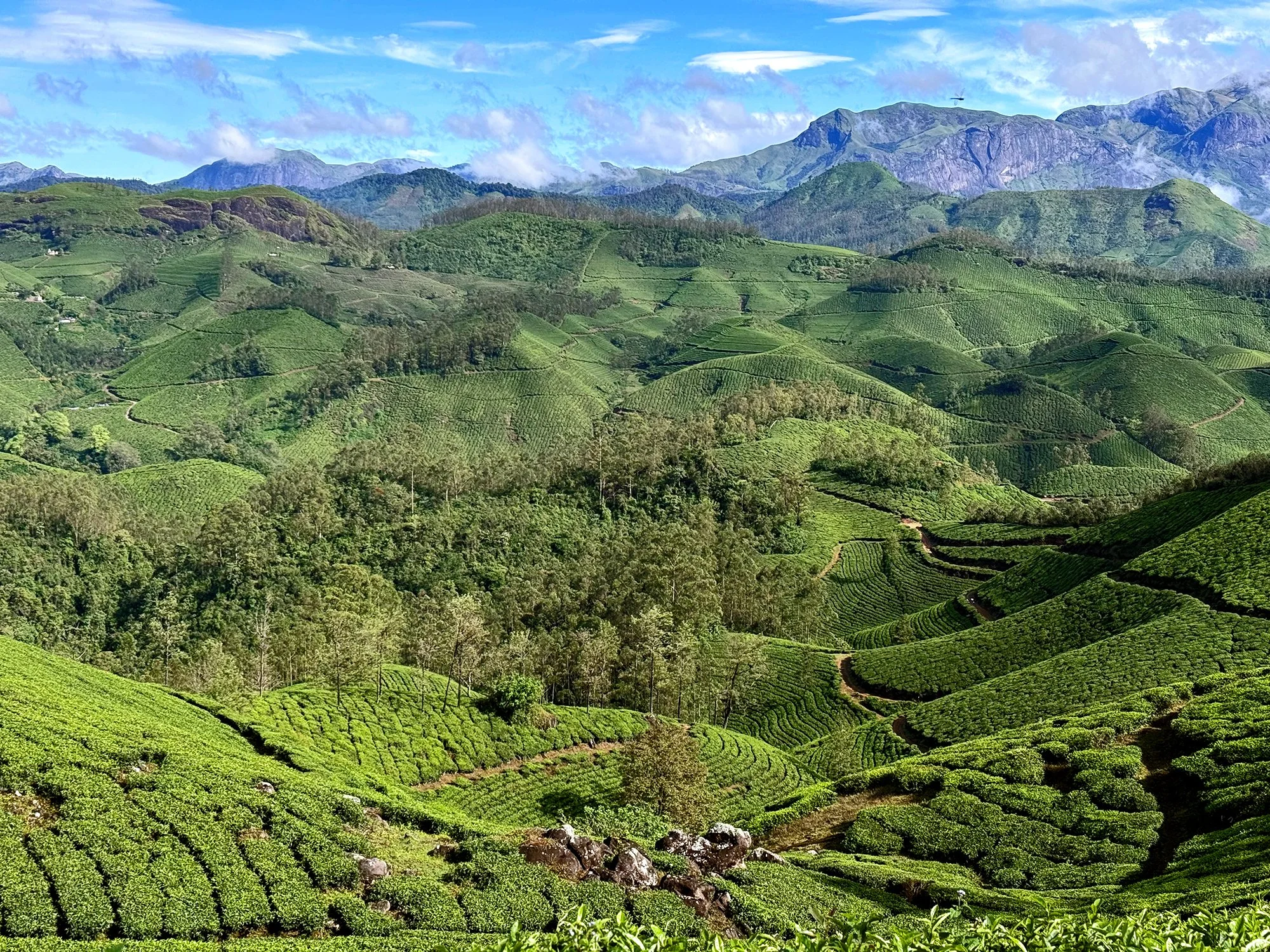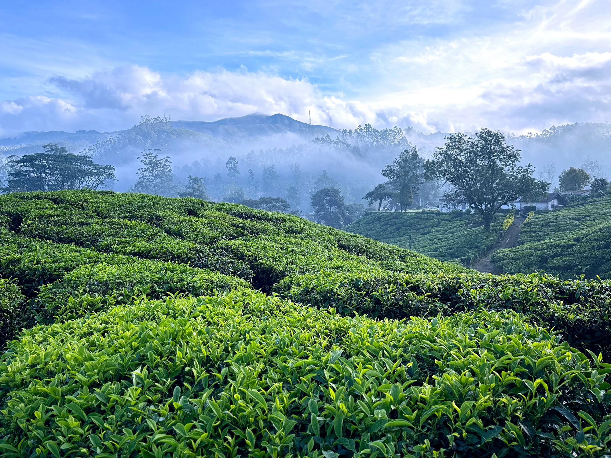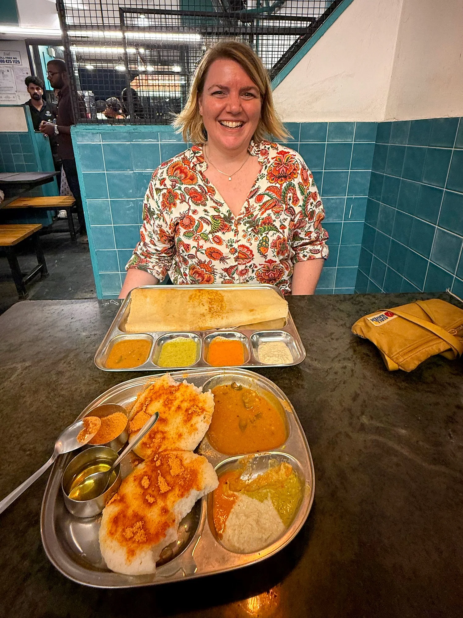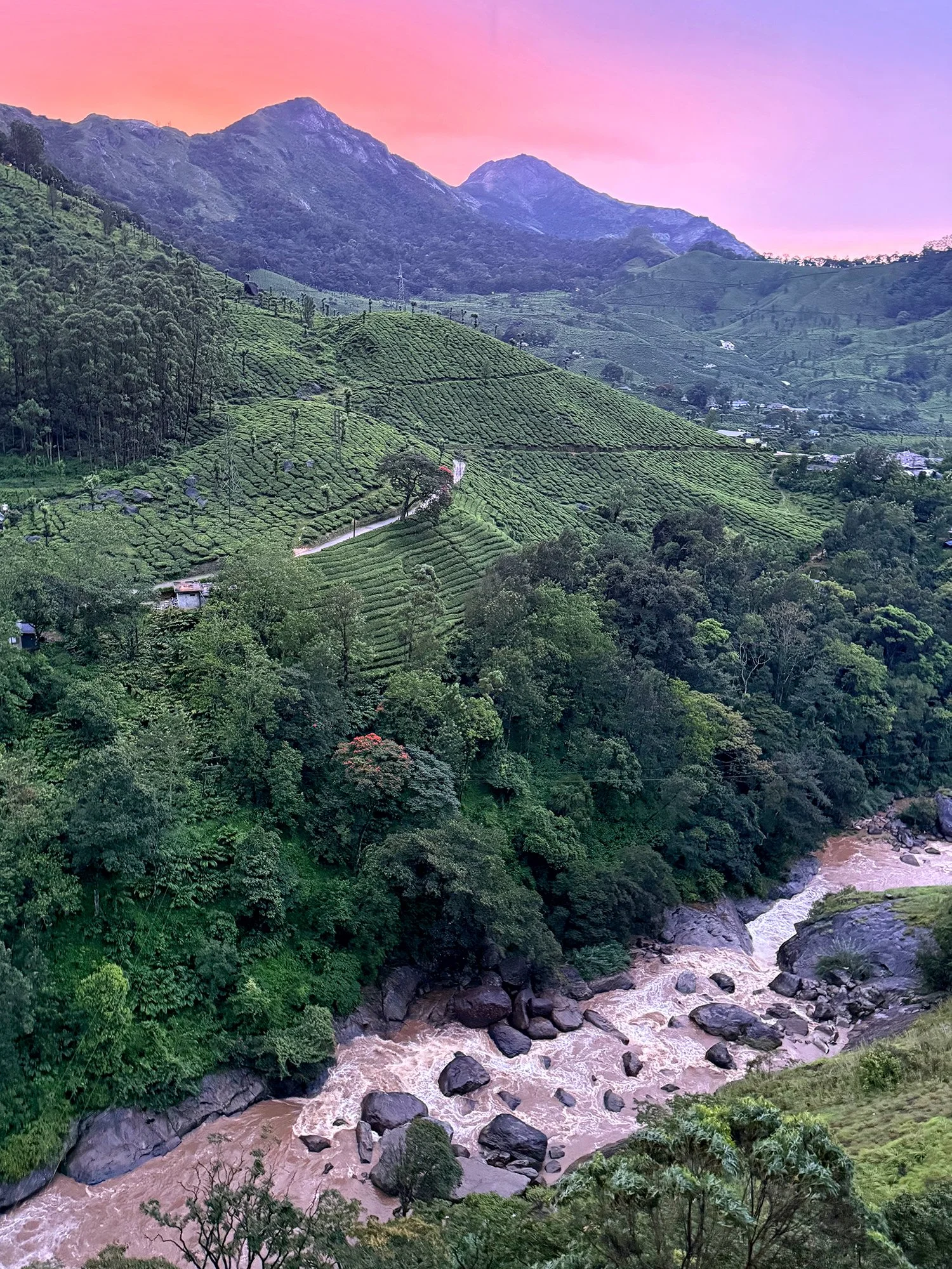 A prearranged cab was waiting for us at the Kochi airport to make the final multi-hour leg of our journey to Munnar. Our driver, Chesin, was a kind, knowledgeable man who acted more as a tour guide than a cabbie, telling us all about the areas we passed. For lunch, he stopped at a bustling restaurant called Rasa that served a Keralan meal called sadhya, which means “banquet” in Mayalam, traditionally served at celebratory events. Multiple dishes are laid out on a banana leaf, including rice, lentil curries, vegetable and coconut curries, thorans (stir-fried vegetables with coconut), pickles, and sweet dishes called payasams. We applied some hand sanitizer and dug in with our fingers, as is the custom in Kerala. The food, unsurprisingly, was delicious, though we definitely felt self-conscious eating a whole leaf full of goops with our hands for the first time.