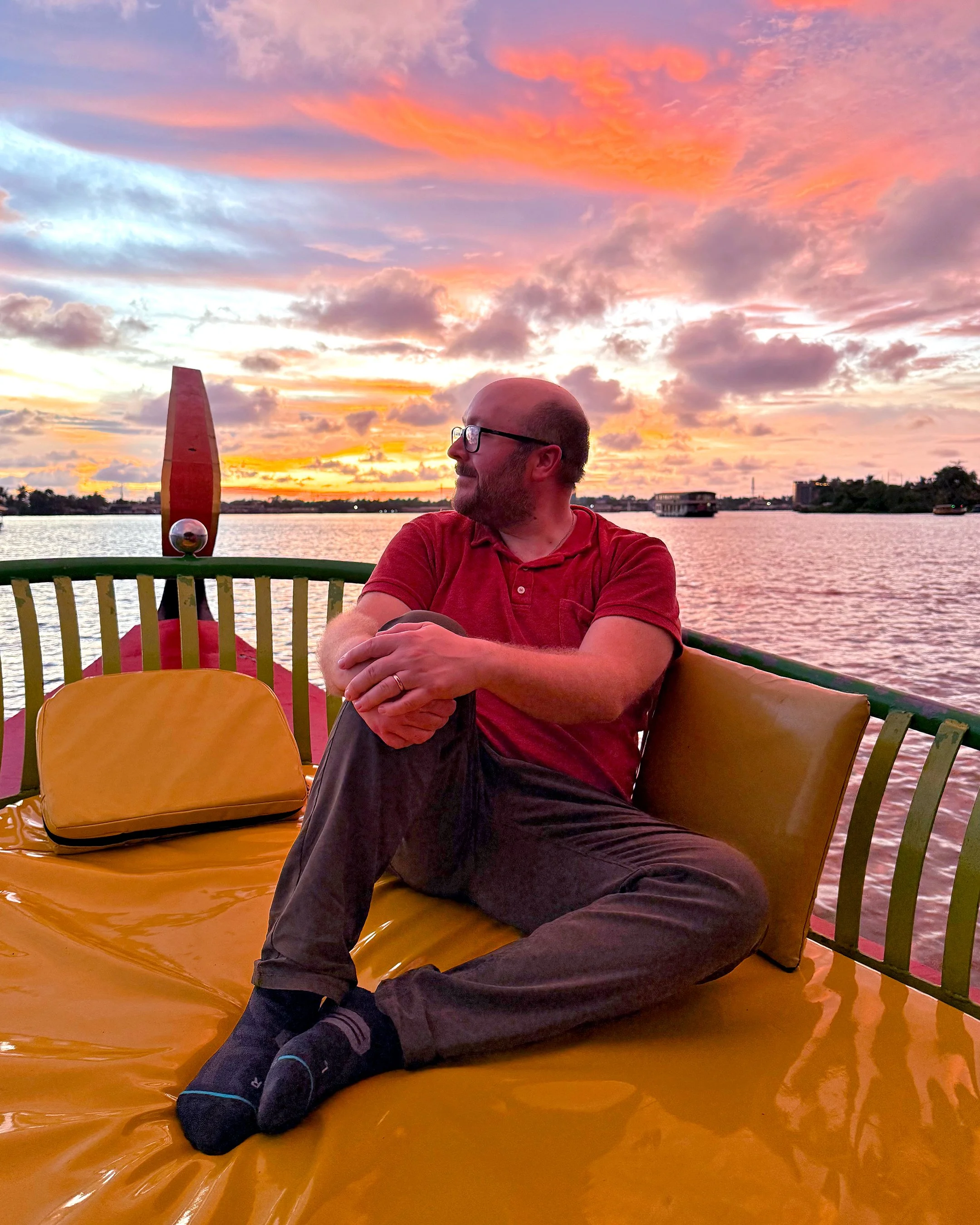 At one point, we stopped for tea and found that the establishment had trained two brahminy kites, which looked like tiny bald eagles, to sit on people’s shoulders and pose for pictures. Brahminy kites are considered sacred in the Hindu religion and are associated with Lord Vishnu, representing his mount, the mythical eagle Garuda. Unlike in Morocco, where someone will stick a monkey on your head and then demand you pay them €5, the trained birds in Alleppey were just an added bonus to the delicious tea and spicy, crunchy snacks. The sunset that evening on the water was awe-inspiring. We only had a few hours to spend in Alleppey and we definitely felt like we spent them right.