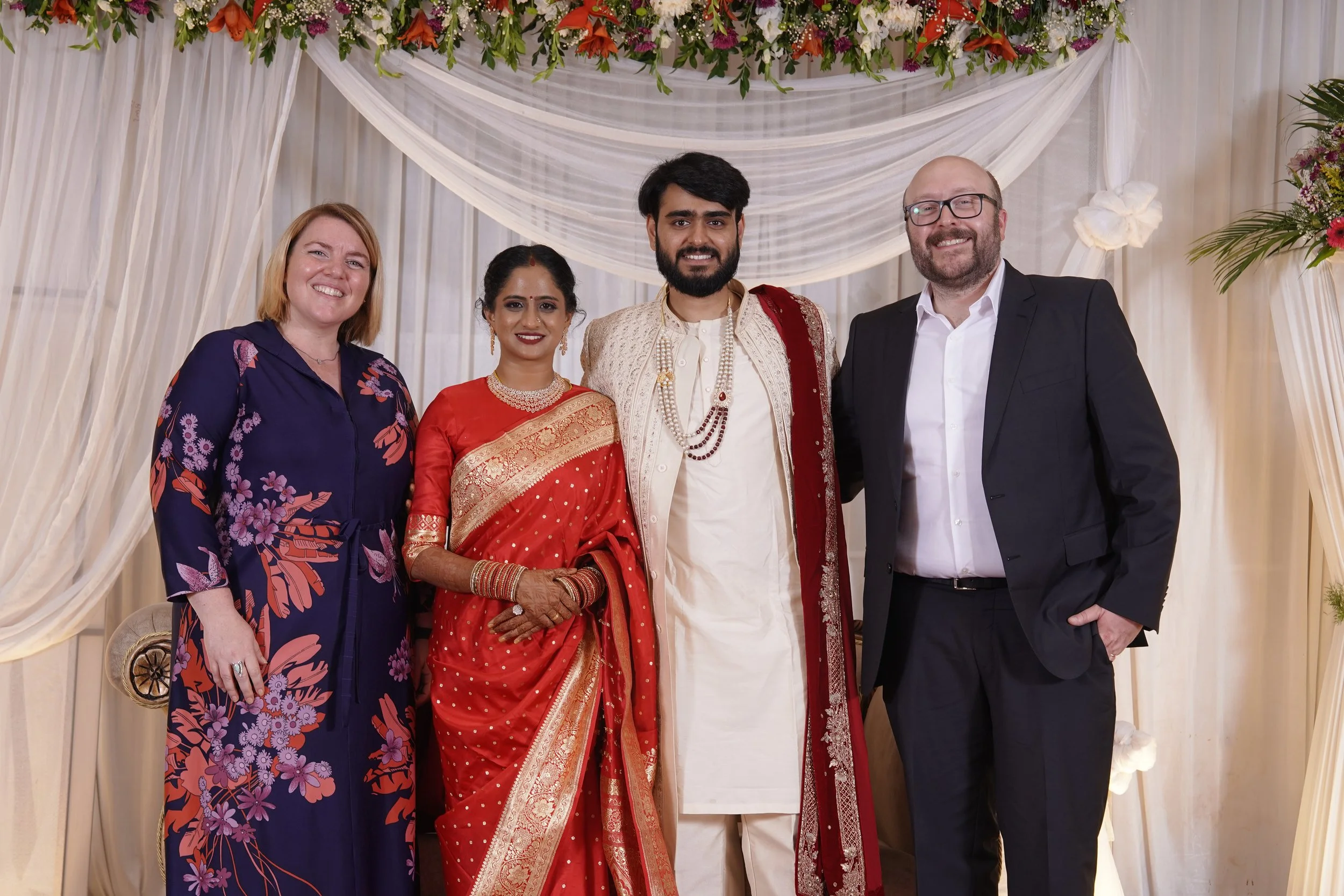 With all the presents dispersed, it is time for a photo shoot. Mazz is given kumkuma - red and yellow powders made from turmeric and saffron for her face - and we are peer-pressured to eat pinches of sugar and coconut out of a bowl that hundreds of strangers’ hands have already dug around in. The room is now full and very, very warm.