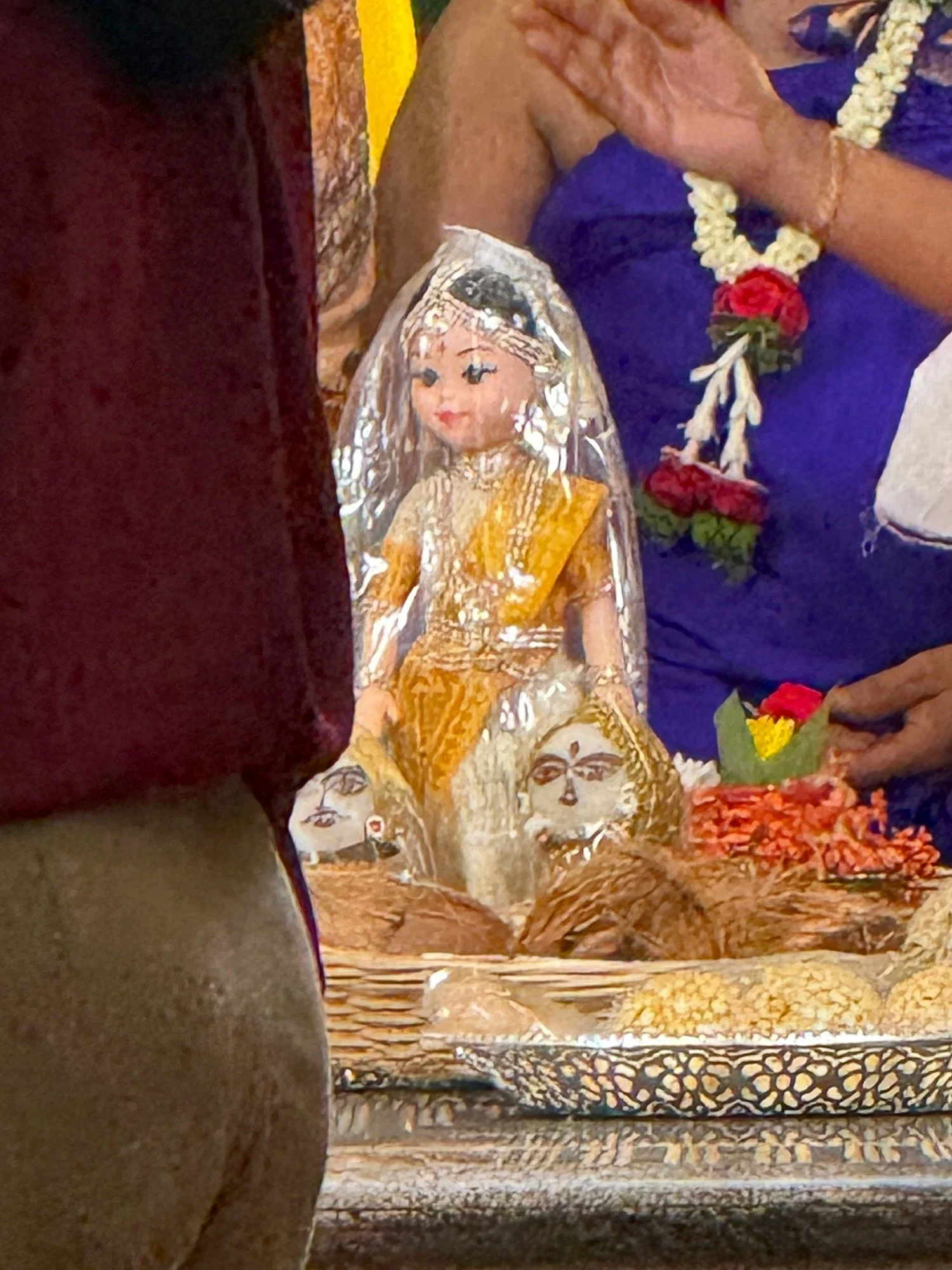 One of the presents given to the groom is a sizable doll of…his future bride? One can only assume that this is a simulacrum representing the transference of the bride from her family to her new husband. We ask our cultural interpreter Chethana and she explains that the doll is made of chocolate and simply represents “something cute.” Surely, she must be mistaken.
