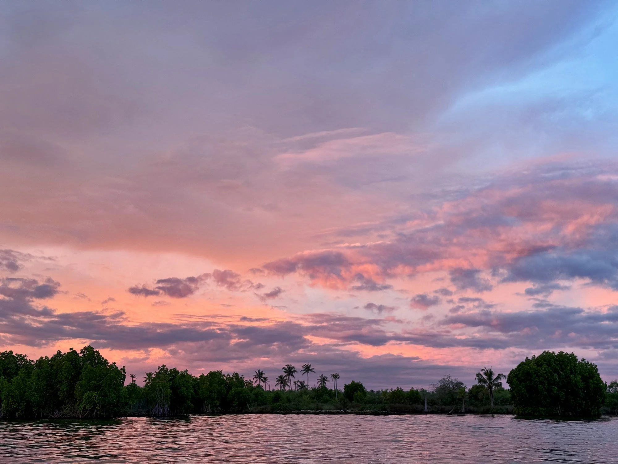 The Kerala backwaters are a long series of brackish lagoons and canals that run parallel to the Arabian Sea, with a relatively small sliver of land in-between. Only a 10-minute tuk tuk ride separated our homestay on the coast from the edge of the backwaters. We knew getting from Munnar would take the majority of the day, so we booked a sunset ride on a shikari: a long, colorfully painted wooden cruising boat. Both the construction and vibrant paint jobs of the shikari reminded us of the trajinera boats we rode in Xochimilco, Mexico back in 2018. For €22, we got an entire boat to ourselves for 3 hours with a skipper to guide us through the canals.